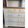 Painted pine kitchen dresser. Large and ideal for big kitchens, open plan spaces etc. Painted grey over yellow and lightly distressed. Worktop polished pine. Shaped cornice over open shelves. Multiple drawers and single cupboard below. Turned wooden knobs. Bracket feet. Very well made. A statement piece.