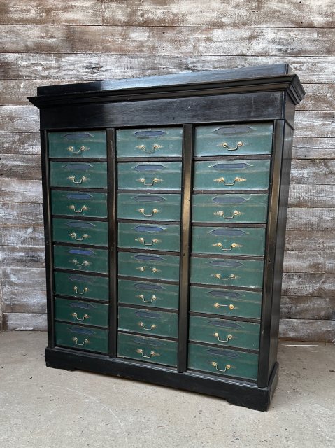 A fabulous bank of drawers with green leatherette fronts with Brass drop handles, painted black wood frame with Oak backing (potentially Oak underneath the paint). Good vintage condition. On the back of the leatherette fronts has the original shop name, made in Paris. (We did not take a photo before fixing them back on, rookie mistake!)